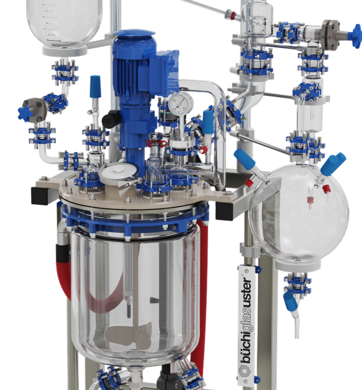 Le design pour atmosphère explosif et les matériaux inertes permettent une utilisation sécurisée pour les procédés avec des solvants et des acides dans un réacteur complètement étanche. La configuration compacte standard du réacteur peut être modifiée facilement, la cuve est interchangeable et différents agitateurs sont disponibles. Le réacteur est installé sur un ascenseur pour permettre une ouverture et le nettoyage facile. La verrerie supérieure de distillation est fabriquée avec raccordements flexibles «buchiflex » pour des réactions chimiques sous vide totale. Nous proposons des solutions complète pour le procédé chimique comprenant des accessoires comme des systèmes d’échantillonnage, sonde pH, colonne de rectification avec garnissage structuré, enregistrement et contrôle des paramètres et l’association avec des équipements auxiliaires comme: Des thermostats, des filtres nutsch, laveurs de gaz pour d’autres étapes du procédé ou des cuves de mélanges.