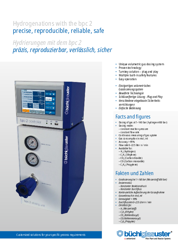 Le système unique de dosage volumétrique du bpc 2 permet une reproductibilité remarquable, une précision de dosage et une consommation de gaz sur une large gamme. Cette technologie robuste est basée sur le modèle précédent, qui a prouvé sa faibilité et sa performance en recherche, changement d’échelle, développement de procédé et optimisation, ainsi que des unités de fabrication de petites tailles dans l’industrie pharmaceutique et chimie. C’est souvent utilisé pour des essais de catalyseurs et les laboratoires de polymérisation.